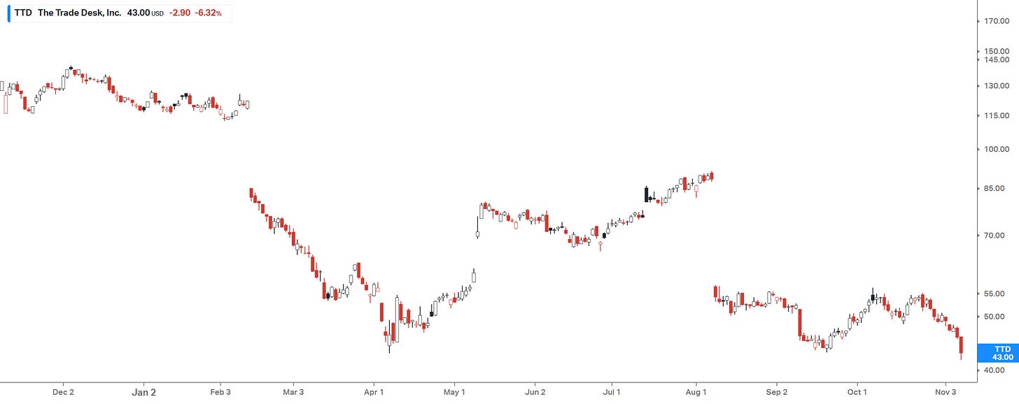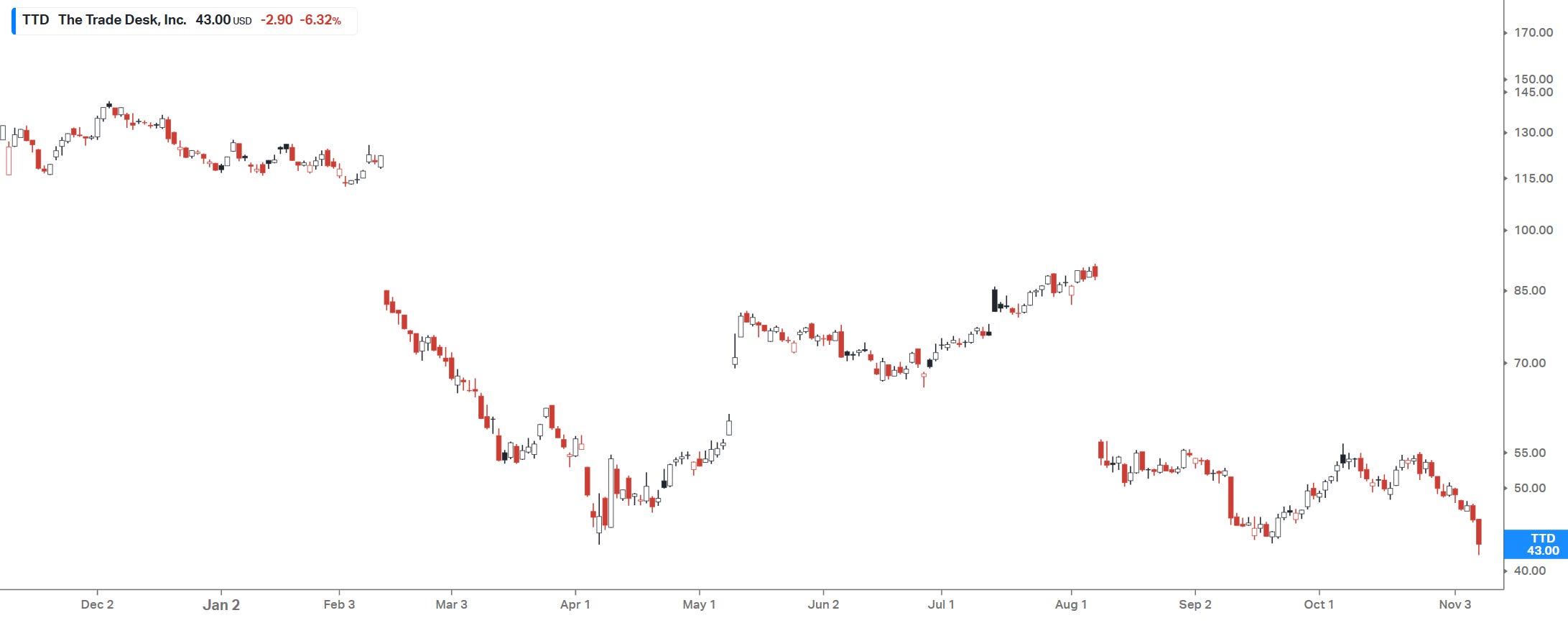 Put differently, the market is already pricing TTD as a “low-end of high-growth” asset; any evidence that it can defend mid-teens growth with stable margins forces a re-rating toward the centre of the peer set.