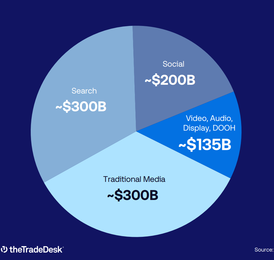 This matters because advertising is one of the largest markets globally, with nearly $1 trillion in annual spend. TTD sits inside the $135b open-internet portion of that market—a slice defined by its accessibility to independent platforms and its mix of video, retail media, and other digital formats. With TTD’s take rate sitting around c.20%, this translates to TAM of c.$26b.