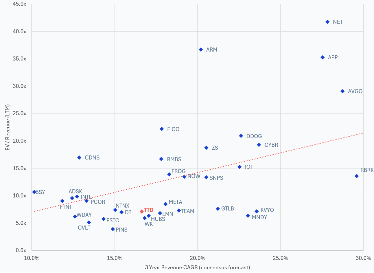To frame TTD’s valuation, we compared it against a set of 37 software peers expected to grow revenue between 10% and 30% a year over the next three years, all with gross margins above 75%. Within this group, TTD sits toward the lower end of the valuation range at 7.3x LTM revenue. Only a few companies with comparable or faster growth — including HubSpot at 6.3x, Monday.com at 6.3x, and Workiva at 5.9x — trade meaningfully lower.