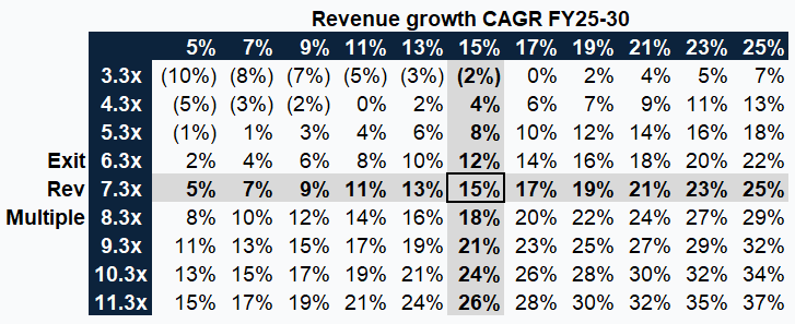 In this scenario, revenue growth decelerates toward a c.10% CAGR, and the multiple compresses toward c.5x revenue.